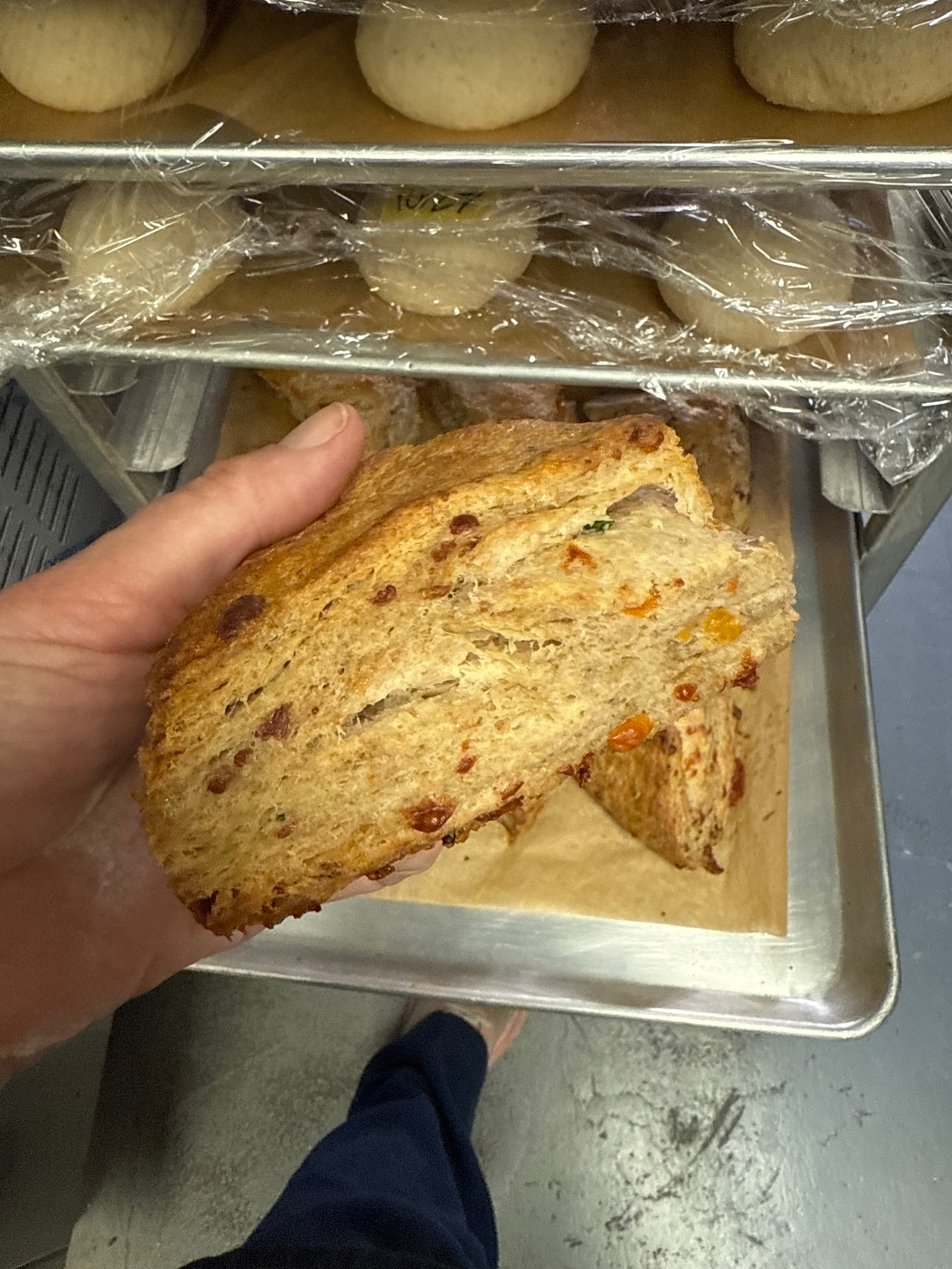 We make these the same way we make our bread — slow, simple, and without shortcuts. Each one is mixed and folded by hand, baked golden, and finished with more cheddar and chives. Perfect with eggs in the morning or wine in the afternoon.