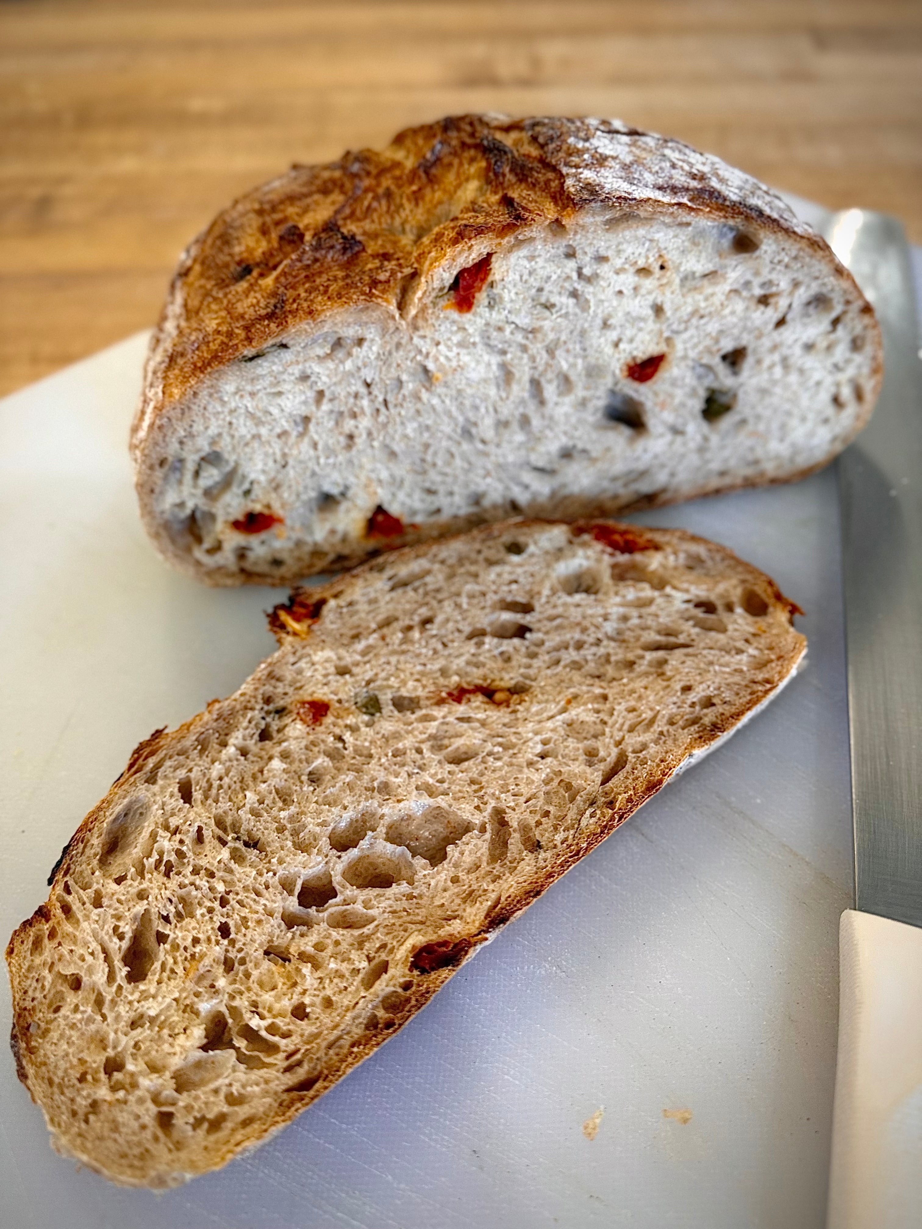 Tangy sun-dried tomatoes, fragrant basil, and creamy mozzarella come together in our naturally leavened sourdough. Slow-fermented for flavor, baked to a golden crust — it’s a rustic loaf with bold, savory character.